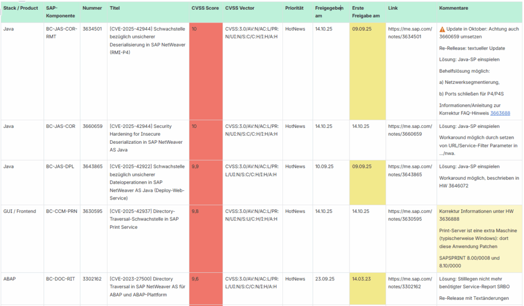 Die monatliche Auswertung der SAP Security Notes werden im Nachgang an das monatliche Review-Meeting zur Verfügung gestellt. Nachfolgend finden Sie einen Auszug der Dokumentation: