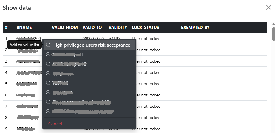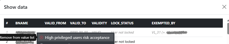 To open the popup for adding a specific “BNAME” to the allow list of the value list, right-click the value in the corresponding column. In this example, this is the “BNAME” column.
