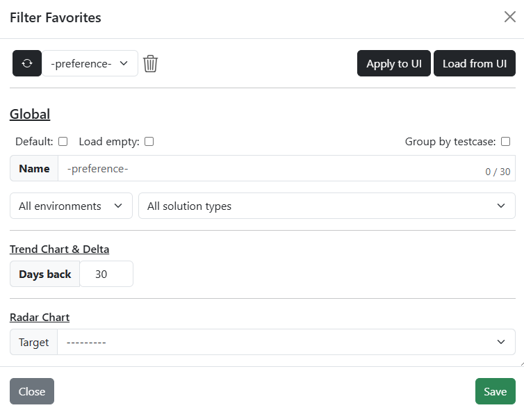Here you can configure your filter preferences. You can save multiple filter variants and select the one you need at any time. When a filter variant is marked as “Default,” it will be loaded automatically each time you open the dashboard.